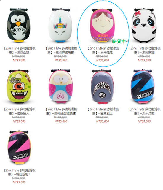 由於「貝比喬」代理的這9款「滑板車行李箱」在台灣賣得很好,尤其是「貝蒂娃娃」目前已銷售一空,其他8款尚有庫存 (其中「波西企鵝」及「克洛伊獨角獸」為新款式),但數量也不多。如果大家對其他8款有興趣的話,不妨趁這次的雙11節優惠下手,提早為「耶誕節」的禮物做準備!。